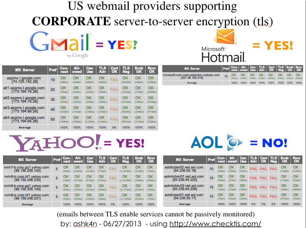 In fact, Google, Microsoft, AND YAHOO (usually last to the crypto party), already support TLS for their own corporate email — just not for their customers (see below). Amidst all the rhetoric about ‘privacy being important’ and ‘companies making strides to improve security’, one can ask — why haven’t companies enabled the basic security features already built into one of the oldest protocols on the internet?